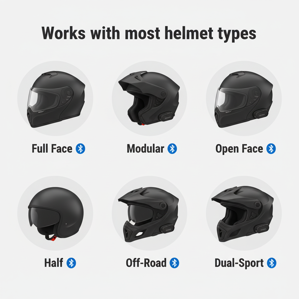 HELMET INTERCOM Y10 is compatible with all major helmet types including full-face, flip-up, open-face, dirt bike, and dual-sport helmets.
